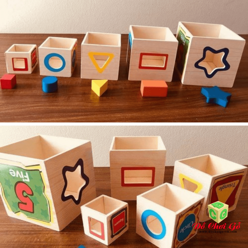 - Sản phẩm bao gồm 5 hộp gỗ rỗng hình vuông với các kích thước khác nhau và các hình khối nhiều màu sắc. Trên mỗi hộp có khoét các lỗ hình khối tương ứng đi kèm.