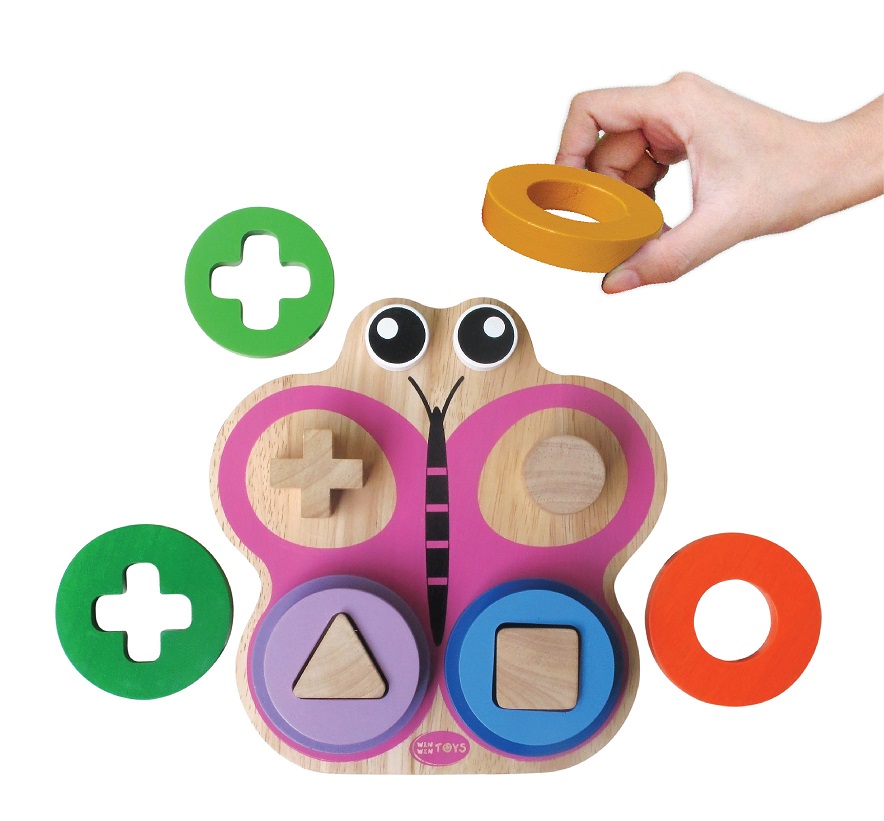 Xếp trụ hình con bướm: Là sản phẩm bảo đảm an toàn cho bé khi bé cầm nắm, và tiếp xúc da. Giúp bé học về màu sắc và côn trùng.